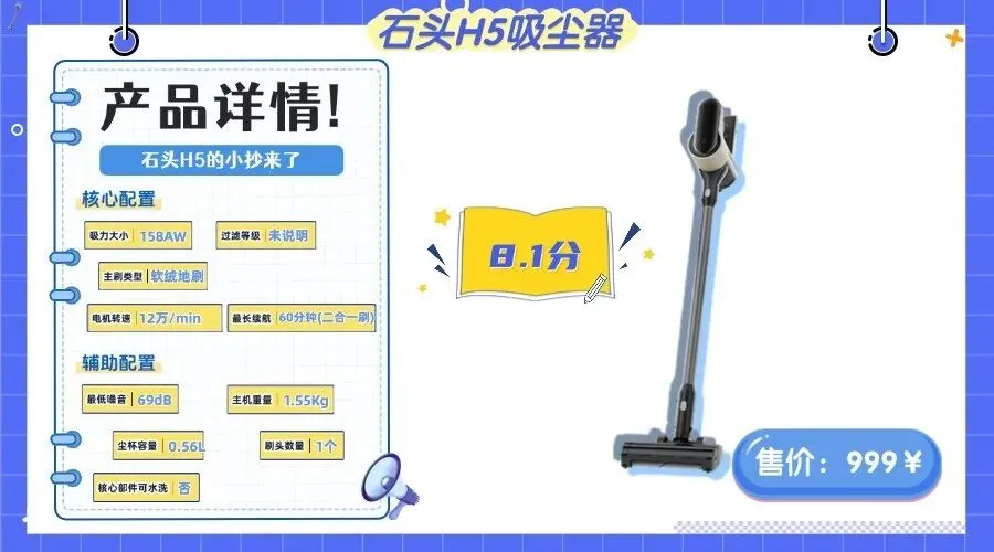 2026家用吸尘器什么品牌好?外观设计:石头H5的设计延续了品牌那种比较高级的审美,整体风格非常适合走极简路线的装修环境。机身线条利落,摆在家里任何角落都不会显得突兀,视觉上给人一种很干练的感觉。