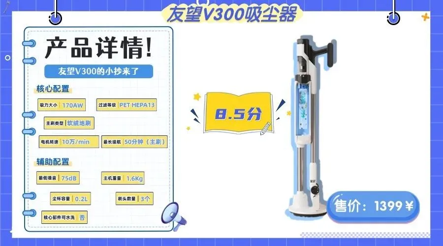 2026家用吸尘器什么品牌好?外观设计:友望V300的外观趋于简洁直观,整体风格比较清爽,适配度挺高。这种柔和的设计方案不会在装修环境里显得突兀,机身的结构排布也比较合理,给人一种很平稳的感觉。