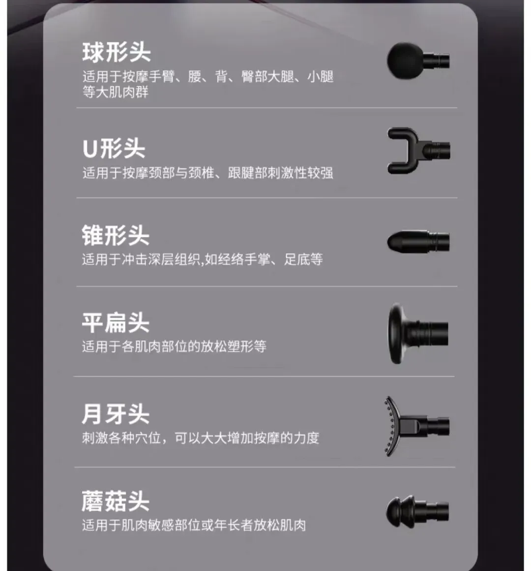 锥形头:可精准对准运动后形成的肌肉结节、久坐引发的腰背酸痛点,深入冲击、缓解不适,针对性极强;