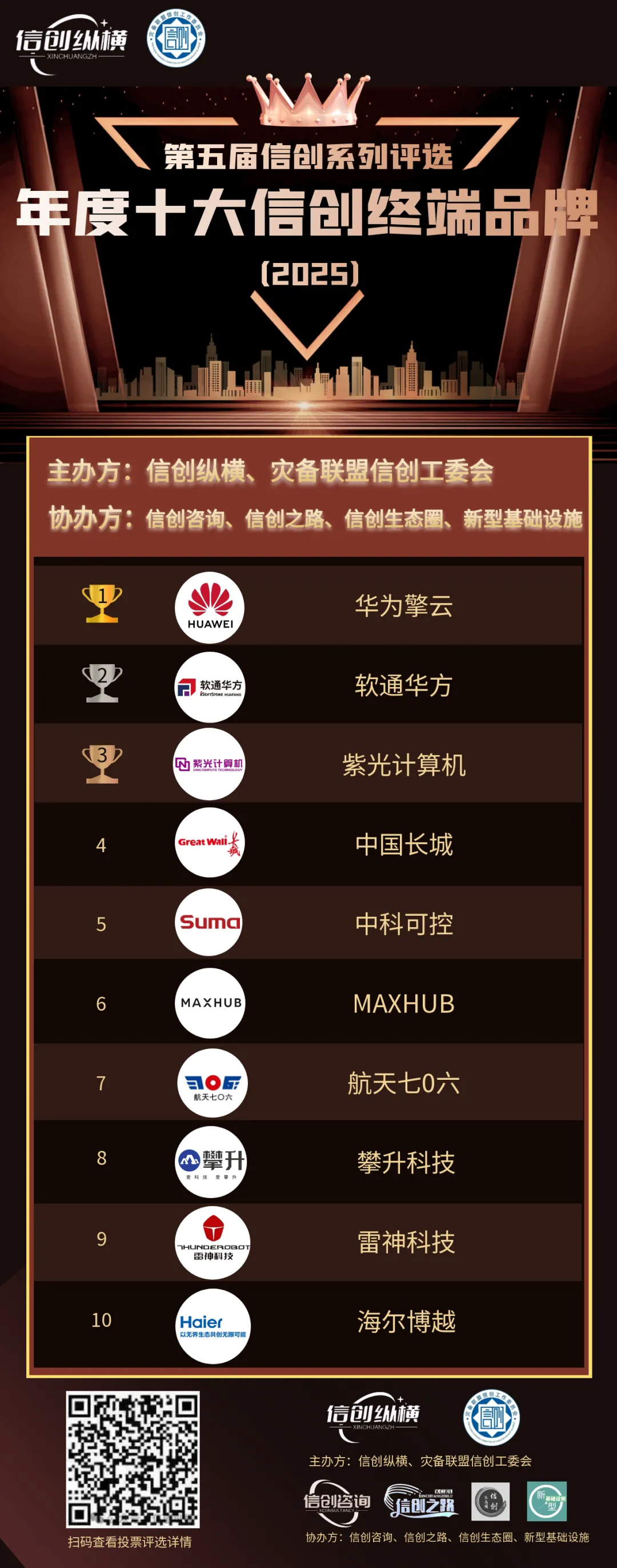 经过10多天竞争激烈的投票阶段,第五届信创系列评选之“年度十大信创终端品牌”榜单出炉了!此次评选,以面向社会公众的投票数叠加面向信创纵横认证会员的投票数,总计票数从高到底顺序排出年度十大信创终端品牌。公众投票结果可扫描海报下方二维码获取。最终名单如下: