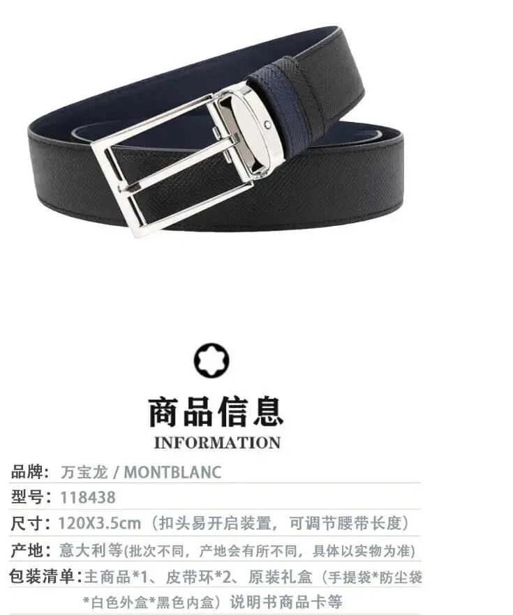 万宝龙(MONTBLANC)大班系列男士商务针扣式皮带/腰带 宽3.5cm 118438黑色/靛蓝色 长120cm(可裁剪)。很多人对万宝龙的印象还停留在钢笔,其实它的皮具同样继承了德式的严谨和匠心。这条大班系列的皮带,将商务气质诠释得淋漓尽致。黑色与靛蓝色的组合非常妙,既有黑色的沉稳,又有一丝蓝色的灵动,让整体看起来不死板,有一种安静的活力。针扣式的设计复古且经典,扣针穿过皮孔的那一下,充满了仪式感。