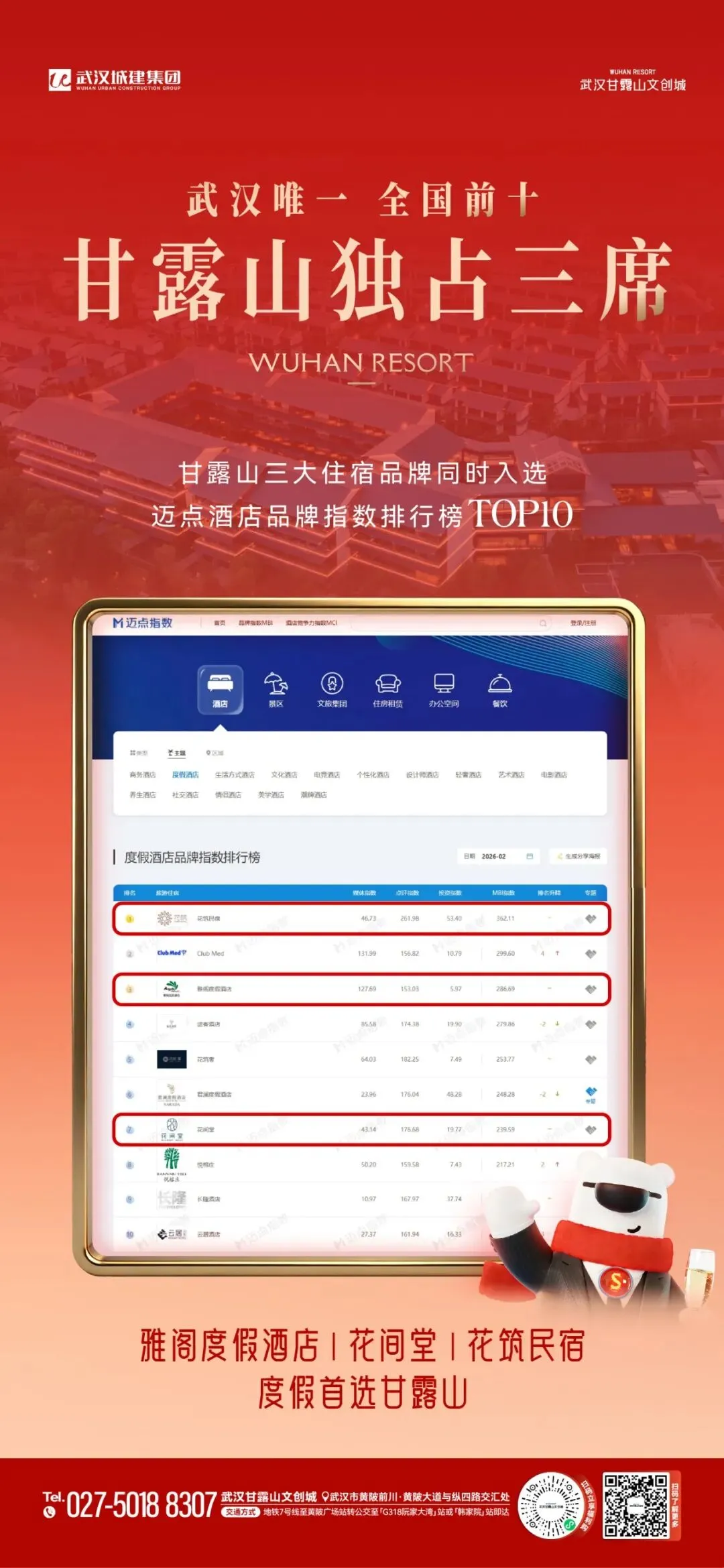 近日,业内权威的《迈点酒店品牌指数排行榜》重磅揭晓,甘露山文创城成为最大赢家,一举拿下全国十强中的三个席位。