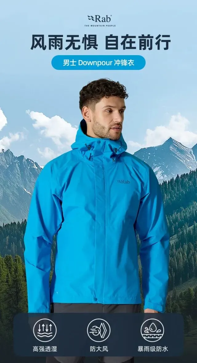 → 防风防水防水指数约 13000mm,可应对中到大雨;全压胶工艺,领口高围设计,能减少雨水顺着脖颈流入内层衣物,高山轻徒步场景适配度高。