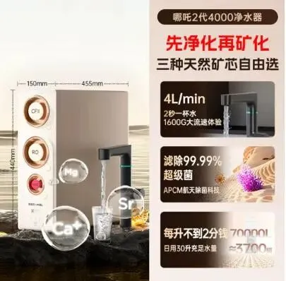 推荐理由:这款哪吒2.0真矿水4000净水器适合用水量大、追求优质饮水的家庭,1600G大通量彻底告别接水等待,满足全家洗菜、做饭、直饮等多场景高频用水,真矿水技术让净水更有营养,口感更佳,反渗透过滤保证水质安全,台下安装不杂乱,整机耐用性强,使用体验远超普通净水机,安吉尔品牌技术过硬,长期用着放心,能提升全家日常用水幸福感。