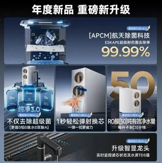 它搭载反渗透过滤系统,能层层滤除自来水中的杂质、异味,让出水干净清甜,达到直饮标准,此外这款机型搭载1200G大通量配置,出水速度快,接水不用长时间等待,此外它自带0陈水功能,每次用水都能喝到新鲜净水,不会存留死水影响口感,机身运行平稳噪音小,不会打扰居家生活,换芯操作也简单,居家就能轻松完成,不用专人上门折腾。