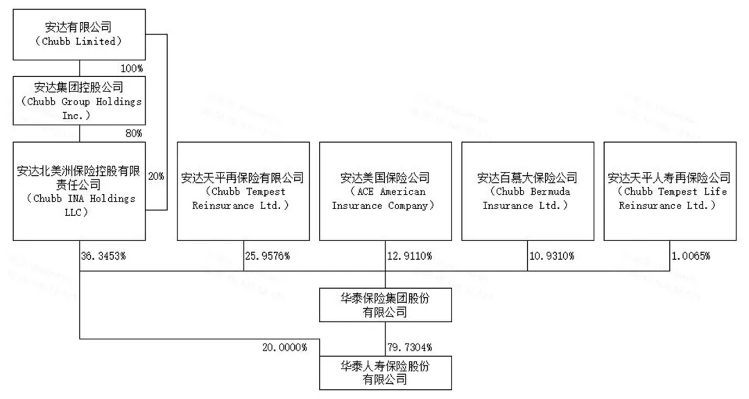注:华泰人寿保险股份有限公司控股股东为华泰保险集团股份有限公司。安达北美洲保险控 股有限责任公司(ChubbINAHoldingsLLC)作为公司股东,同时与其母公司安达集团部分子 公司亦为华泰保险集团股东,以致上述安达集团子公司直接及间接持有公司股权比例超过 50%。故上述安达集团子公司的实际控制人安达有限公司(ChubbLimited)为公司实际控制 人,其亦为公司控股股东华泰保险集团股份有限公司实际控制人。