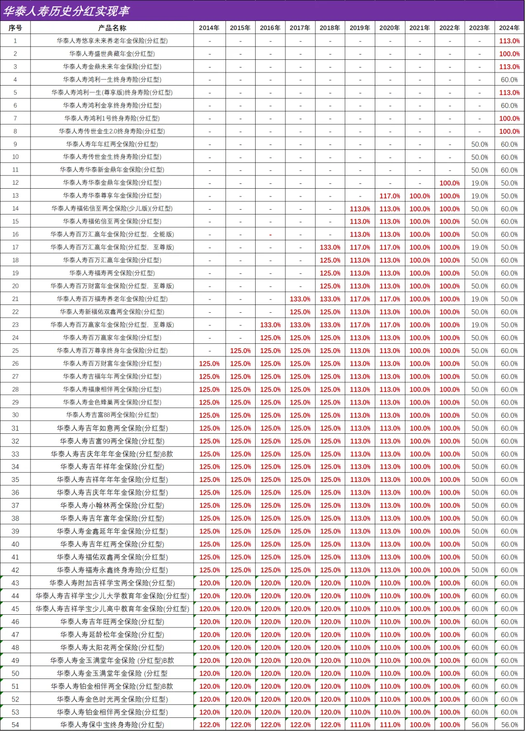 3、历史分红水平注:1.披露数据包含评估年度含有效保单的所有分红险种,该实现率不代表未来的红利实现率水平;2.分红实现率的计算方式为:分红实现率 = 实际派发的红利金额/利益演示的红利金额;3.测评保司产品的客户收益率的高低,不能单纯看历史分红实现率,还应该结合产品的预定利率和演示利率进行综合测评。