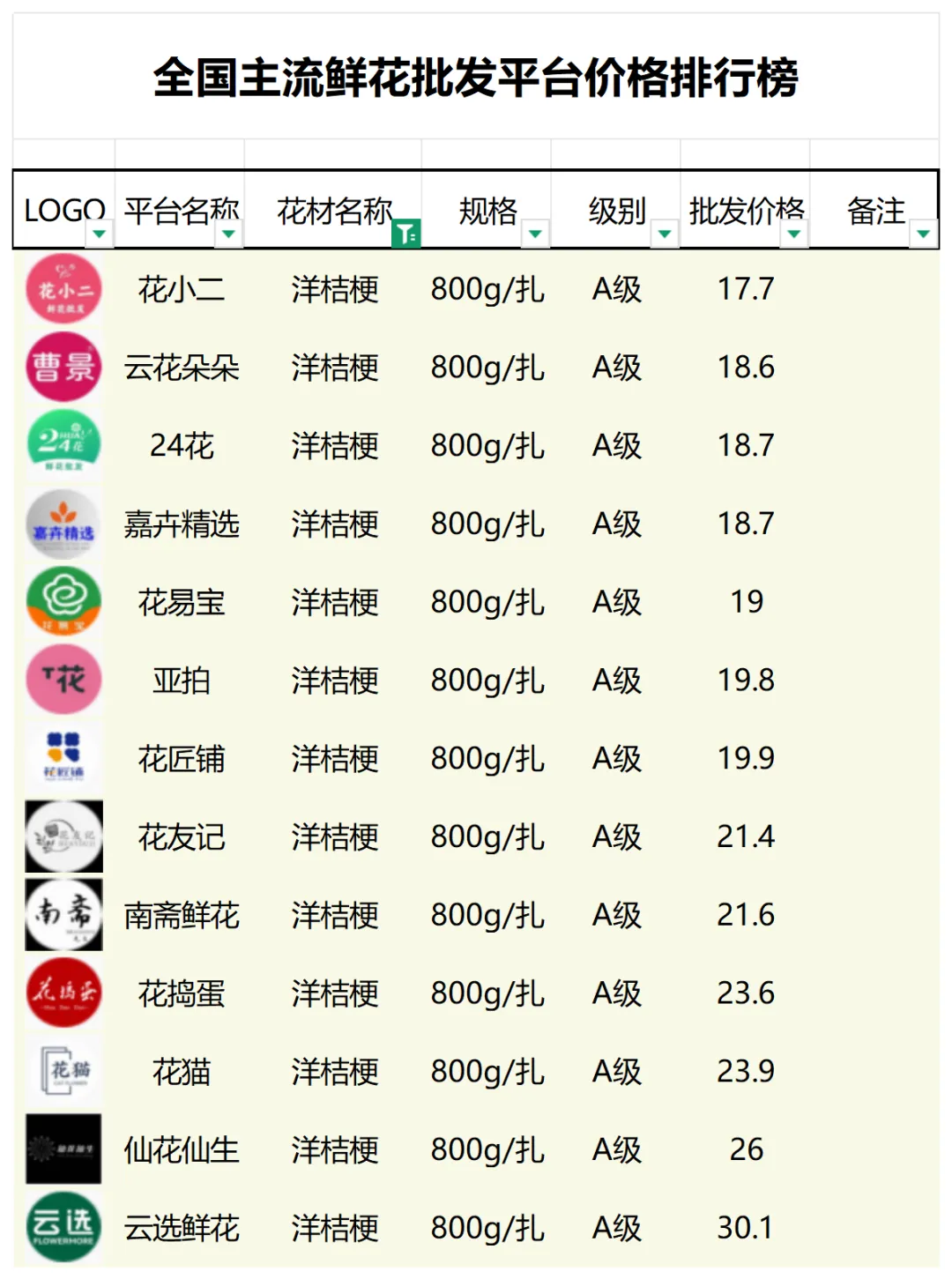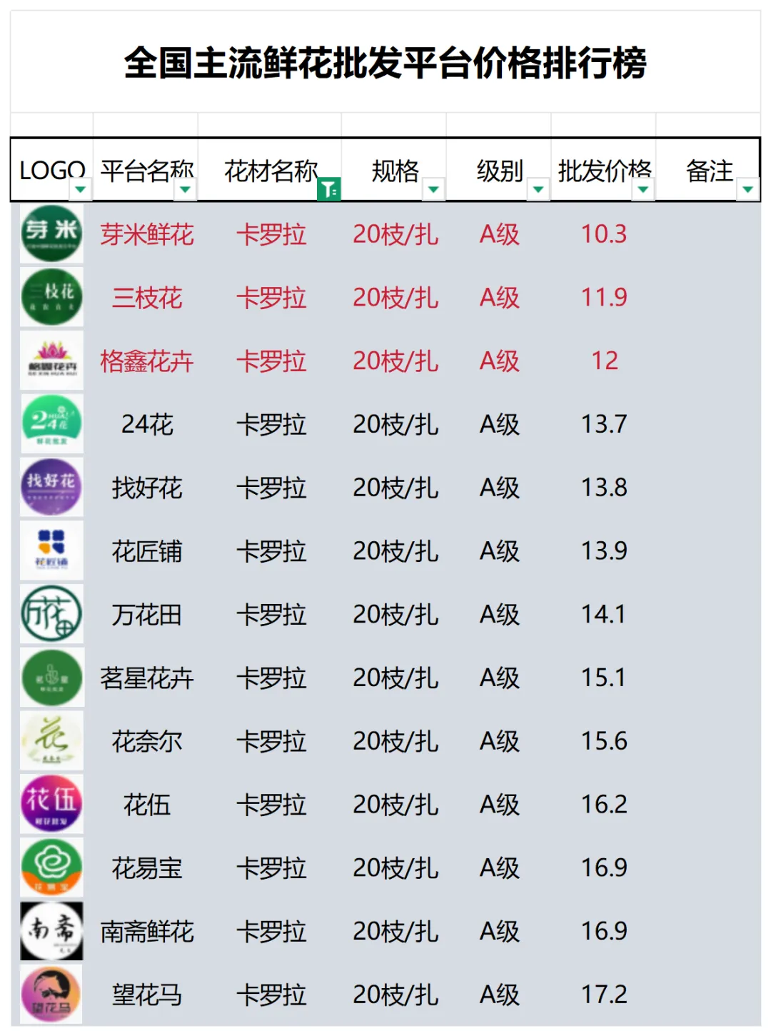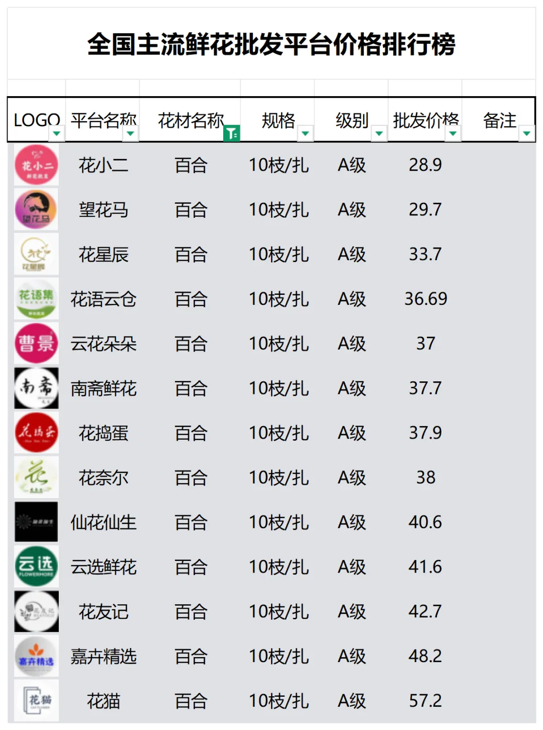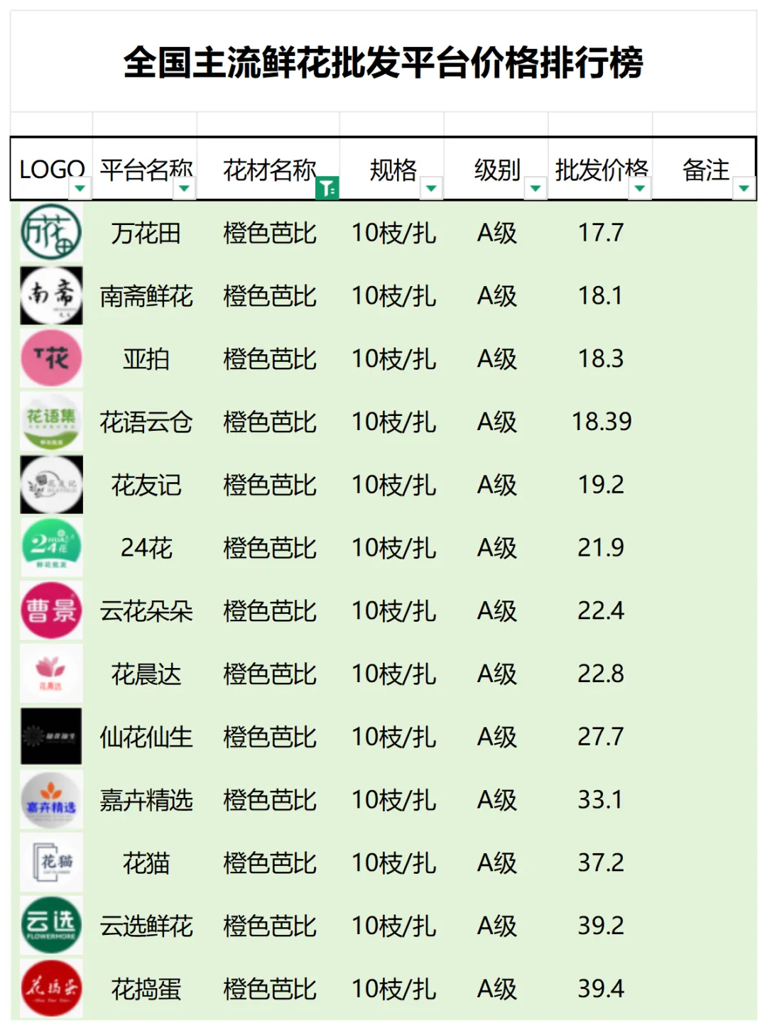 2、本数据只收录A级花材批发价格,覆盖全国大部分主流鲜花批发平台