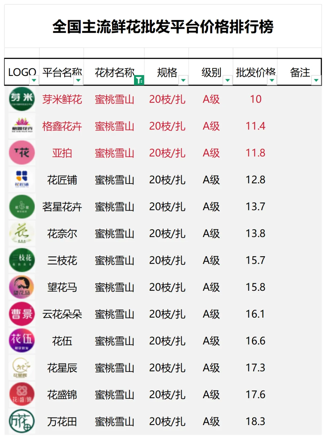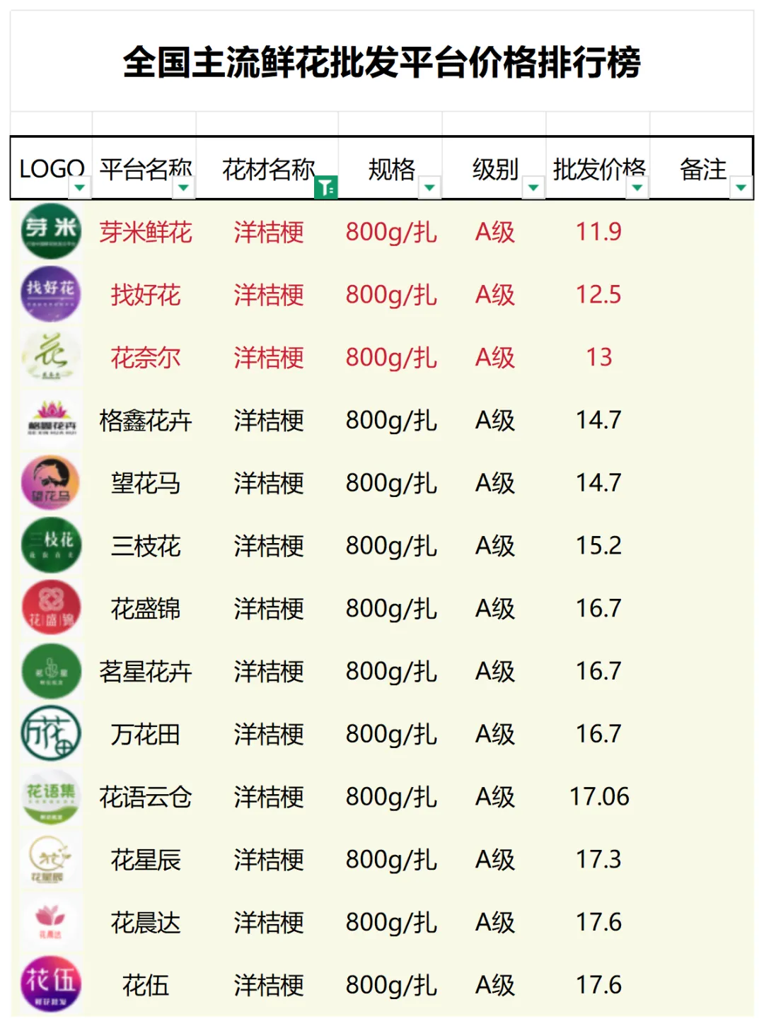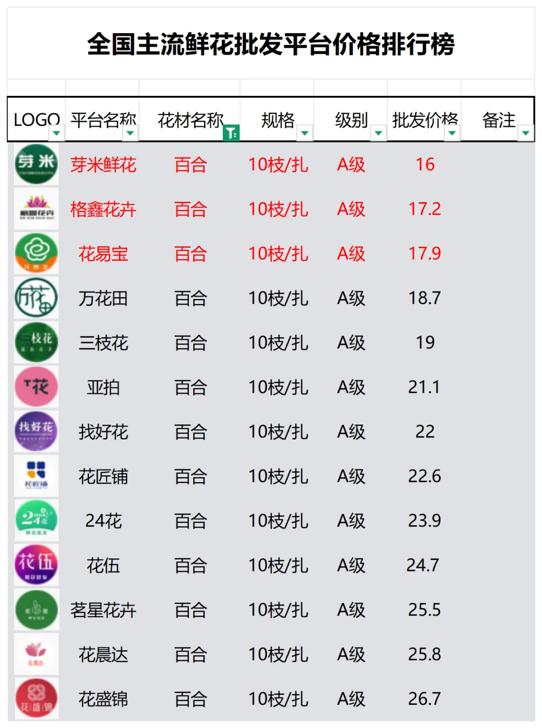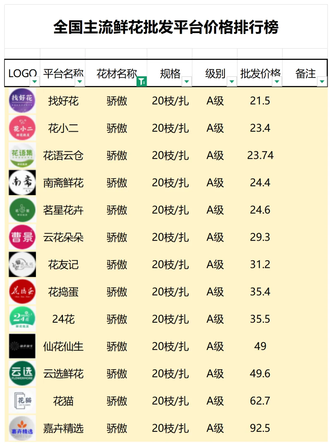 2、本数据只收录A级花材批发价格,覆盖全国大部分主流鲜花批发平台