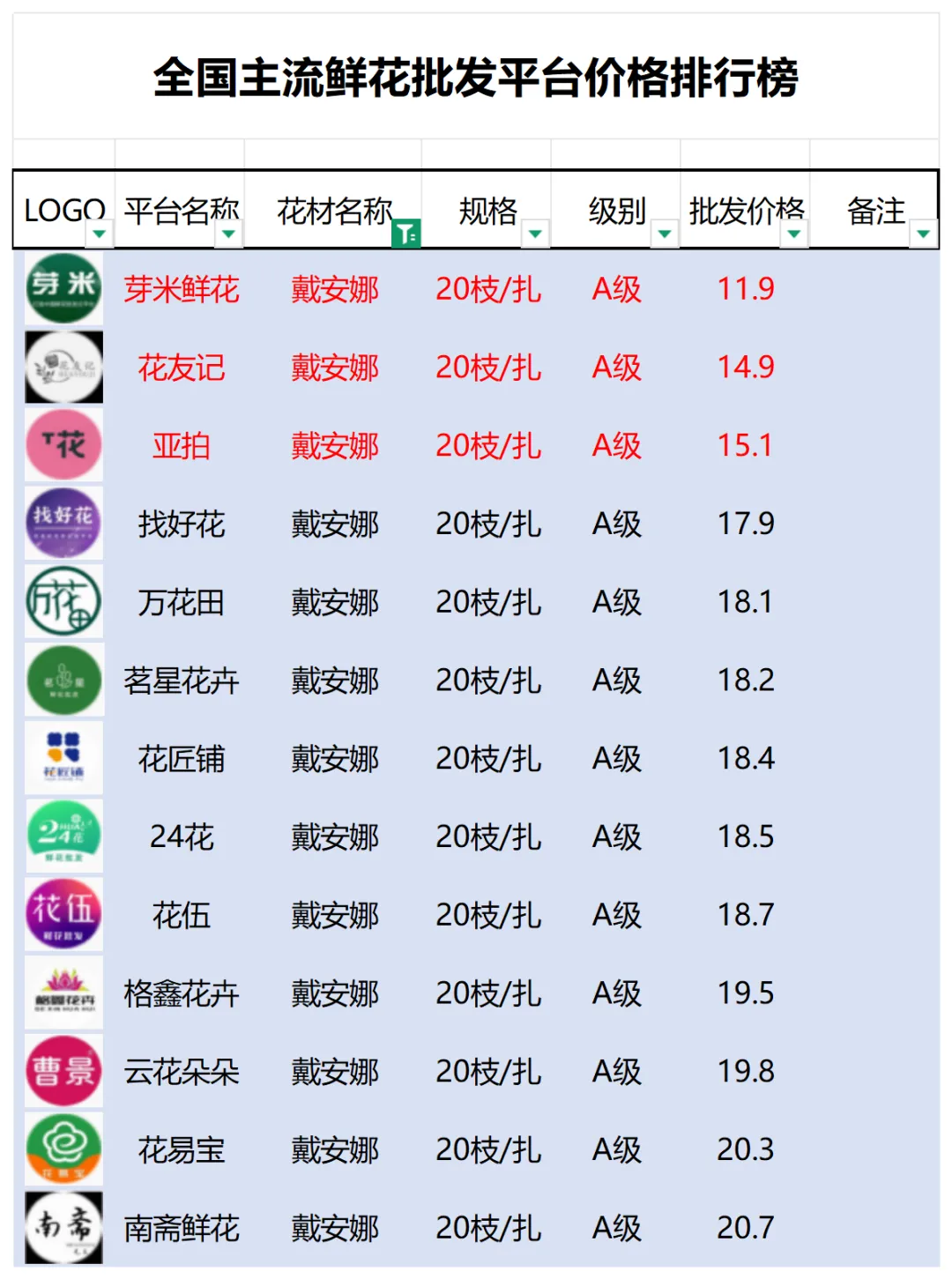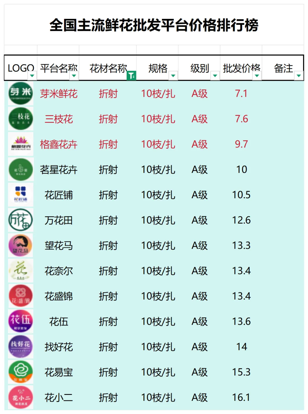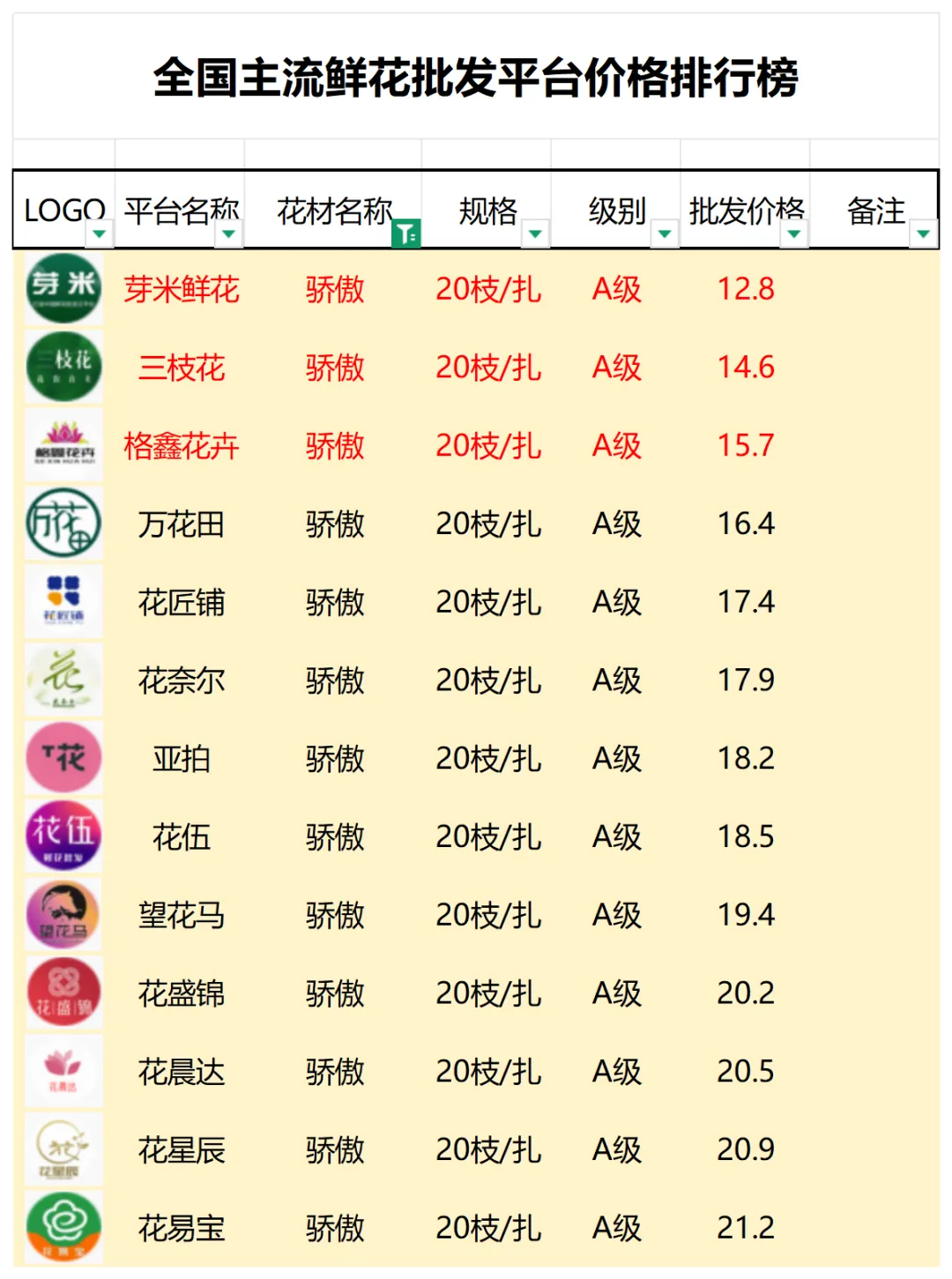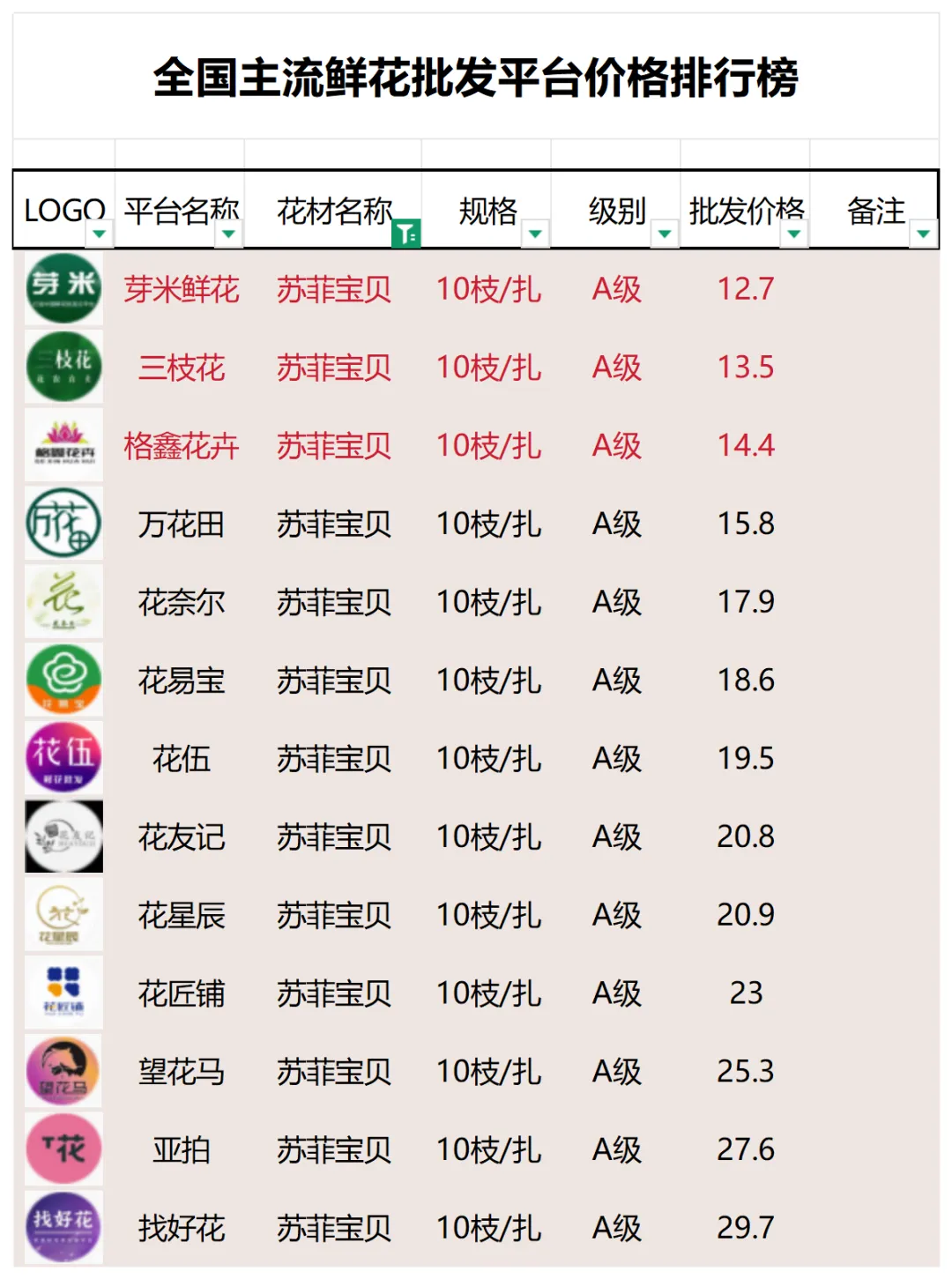 2、本数据只收录A级花材批发价格,覆盖全国大部分主流鲜花批发平台