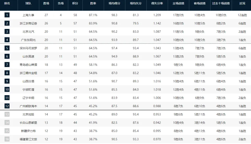 CBA常规赛第31轮已经全部打完,经过这轮精彩的较量之后,积分榜排名又发生全新的变化。深圳107-104险胜福建,广东93-96惨遭北京大逆转,江苏78-72险胜吉林,山西100-94力克山东,广厦91-81击败四川,上海112-96大胜天津,北控94-78大胜宁波,辽宁77-93惨败广州,浙江100-96加时险胜青岛,新疆94-87力克同曦。北京首钢逆转广东男篮杀进前三,目前战绩20胜11负排名联赛第三,辽宁男篮2连败则是跌入谷底,排名降至联赛第十一名,深圳男篮六连胜则是逼停广东男篮,目前第三到第六的战绩都是20胜11负,竞争已经到了白热化阶段。