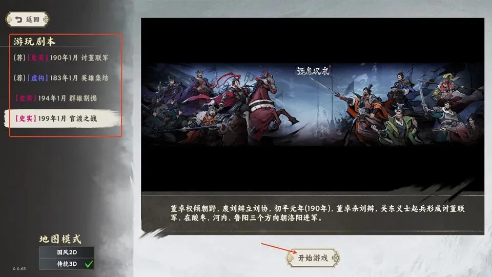 2、选择游玩剧本,如讨董联军、英雄集结、官渡之战等,还可以选择地图模式,之后开始游戏即可;