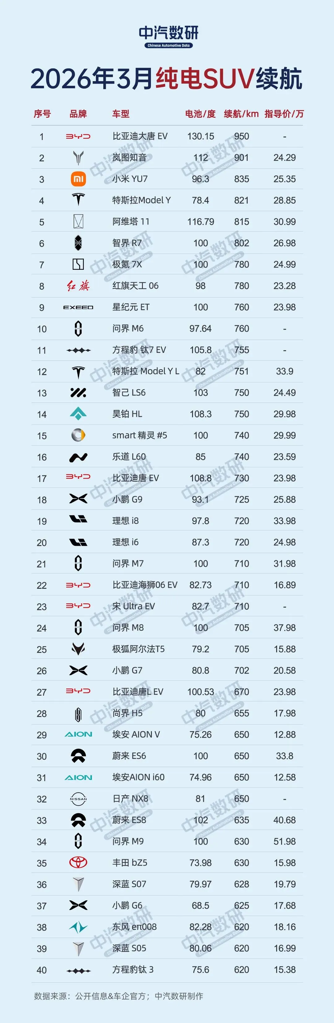 比亚迪大唐 EV,电池130.15度,续航950km;