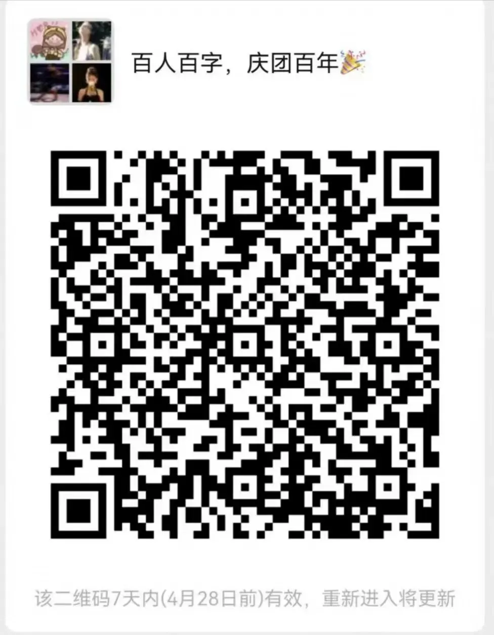 我们将一起撰写一百字祝词庆祝建团百年,在全院召集一百位同学,在疫情允许的前提下,利用运动世界校园app记录路线,亲身走出对应字的字样,用实际行动庆祝团的百年生日。