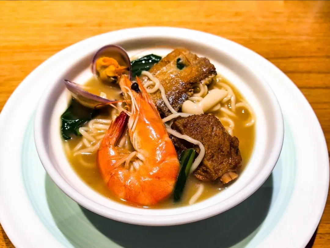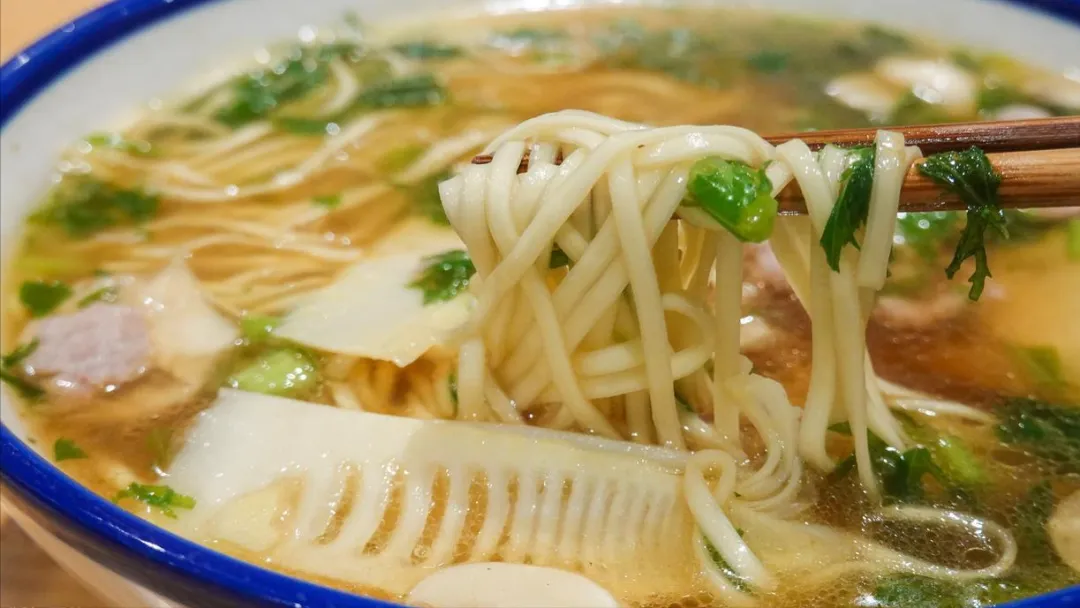 汤头要用猪筒骨和老母鸡熬足两小时,面滑汤浓,咸鲜适中。
