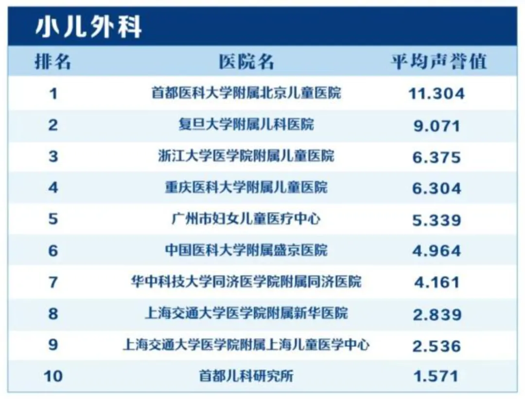《中国医院专科声誉排行榜》自发布以来,该院小儿外科一直排名全国第一,多个亚专业都处于国内领先位置: