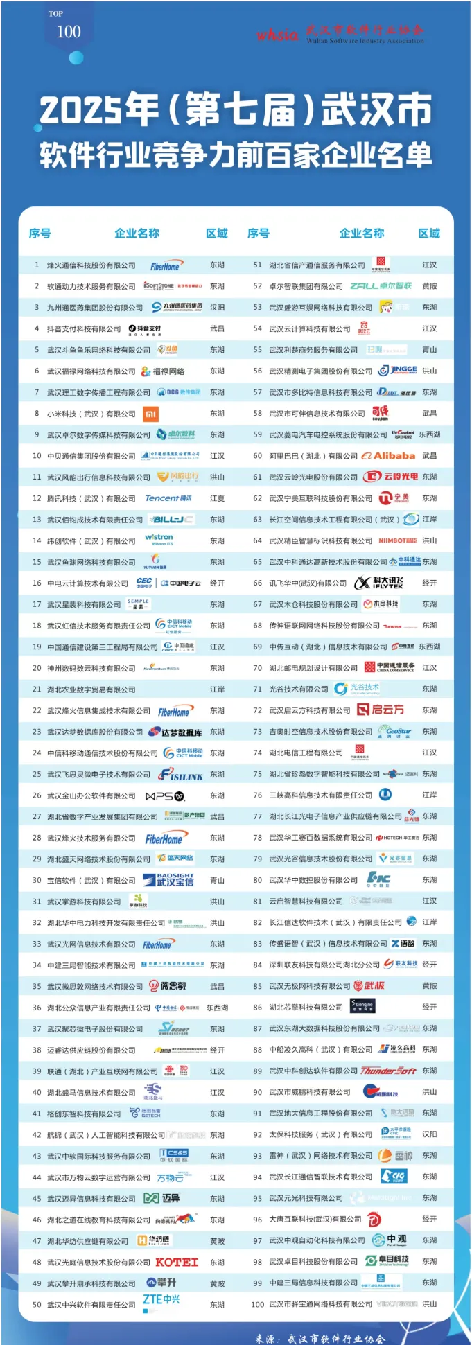 根据武汉市软件行业协会发布的数据,百强企业区域分布如下: