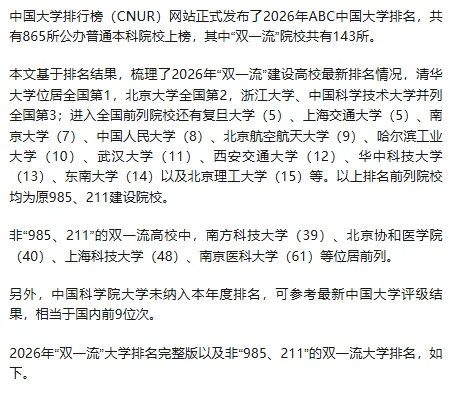 ABC中国大学排名作为ABC排名系列年度重磅研究成果,是具备独特观点的大学排名,排名结果宏观体现国内院校综合竞争力。该榜单由ABC咨询机构独家编制,旗下中国大学排行榜(CNUR)网站发布。