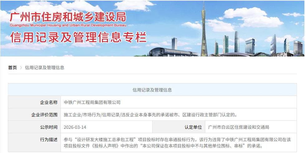 广州市住建局信用记录专栏显示,中铁广州工程局集团有限公司,因串通投标,于3月14日被正式公示。