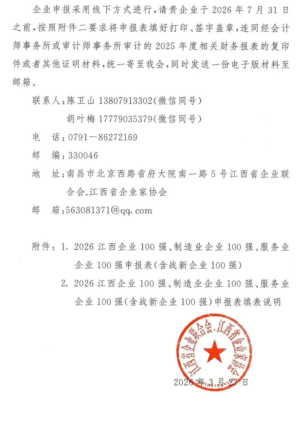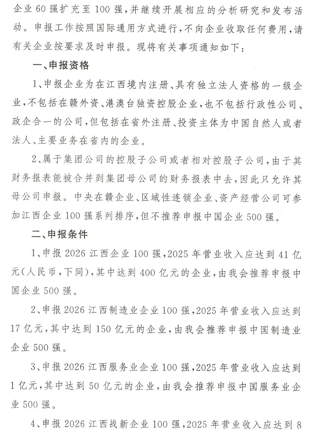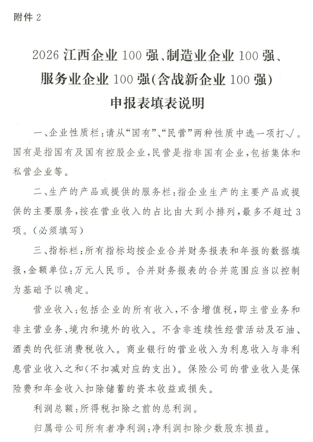 1、赣企联【2026】7号 关于申报2026江西企业100强、制造业100强、服务业100强、战略性新兴产业100强的通知(PDF版)