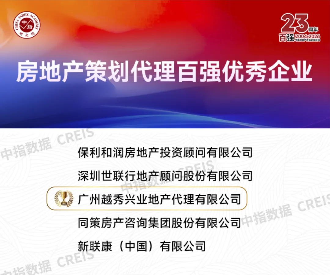 越秀地产下辖企业、广州市房地产中介协会副会长单位——广州越秀兴业地产代理有限公司(以下简称“兴业地产”)凭借“全程策划+销售代理+签约售后+二手租售”全链条服务能力,以及持续深化的数字化营销、自渠建设与客户经营创新,荣膺“2026中国房地产策划代理百强企业TOP3”,较2025年上升2位。