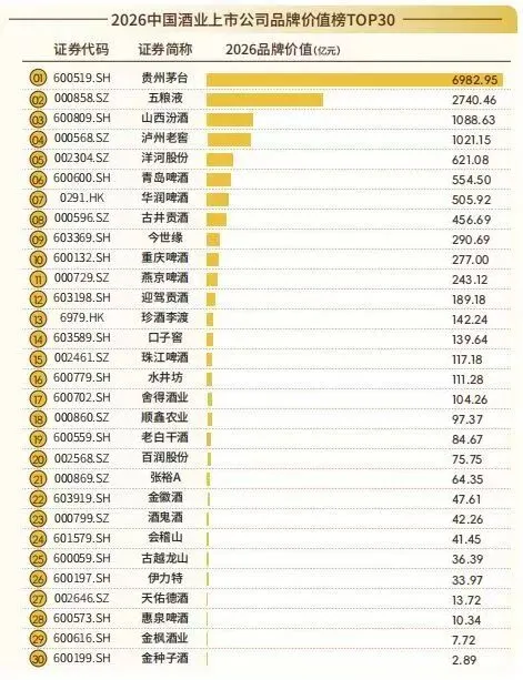 3月26日,由《每日经济新闻》主办的2026酒业创新思享会在成都举行,会议发布了“2026中国酒业上市公司品牌价值榜TOP30”。