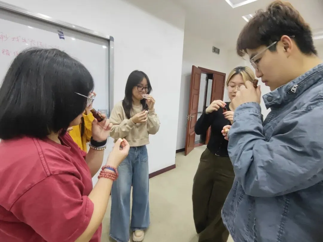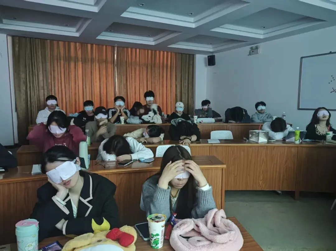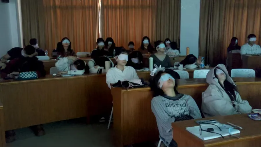随后进入沉浸式课堂疗愈体验环节。课堂倡导同学们暂时放下手机,远离电子设备干扰,为每位同学发放蒸汽眼罩,并搭配轻柔舒缓的自然白噪音,引导大家静心休憩、回归自我。在20分钟的疗愈时光里,同学们卸下疲惫、放松身心,不少同学在宁静氛围中逐渐舒缓紧绷情绪,甚至进入浅眠状态,真切体会到自然疗愈对身心状态的积极调节作用。