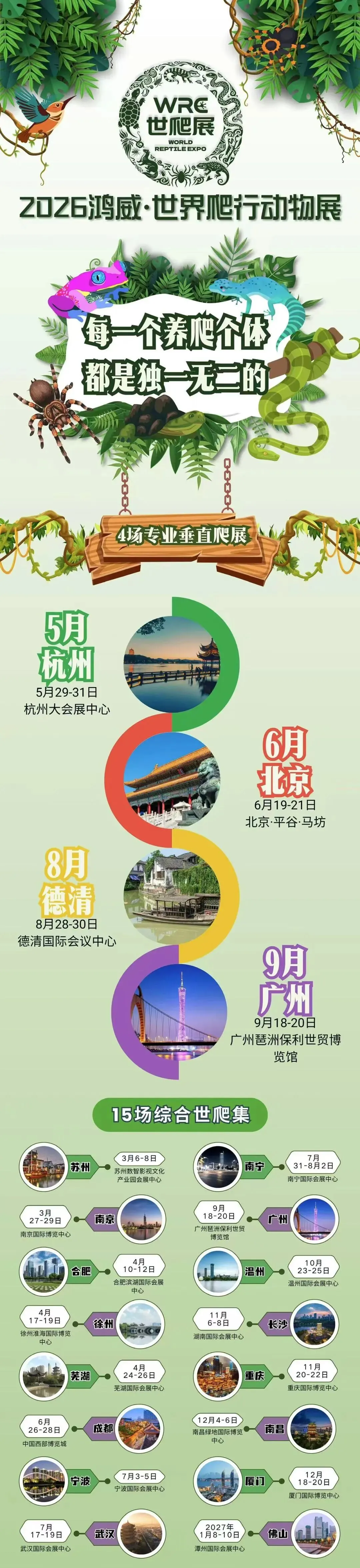 WRE世爬展是在Z时代下诞生的爬宠行业标杆性盛会。涵盖:蛇、乌龟、蜥蜴(蓝舌、守宫、变色龙)、鸟类、蛙类、昆虫、小宠、异宠、智能设备、医疗、主粮、营养品、周边文创用品等全产业链。WRE世爬展以“生态共生,探索爬行新纪元”为主题,旨在链接全球,打通爬宠行业产业上下游的标杆性盛会。WRE世爬展以“B2B+B2C”双轨模式推动商业落地,让活体繁育、器材研发到终端服务全线贯通。