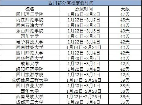 在目前统计的四川高校中,四川理工学院以47天的寒假位居榜首,放假天数最少的是成都理工大学。