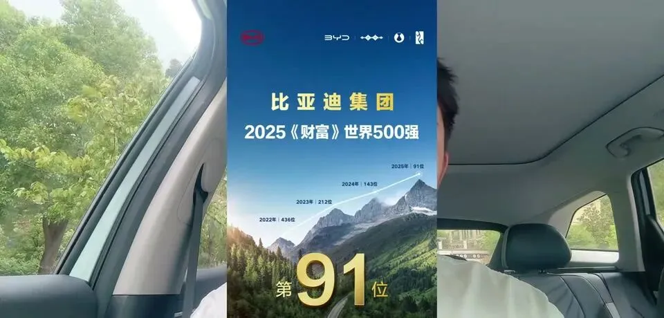“比亚迪集团2025年财富世界500强排名,第91位,比亚迪连续四年上榜世界500强,今年更是一举拿下世界百强第91名的好成绩。”