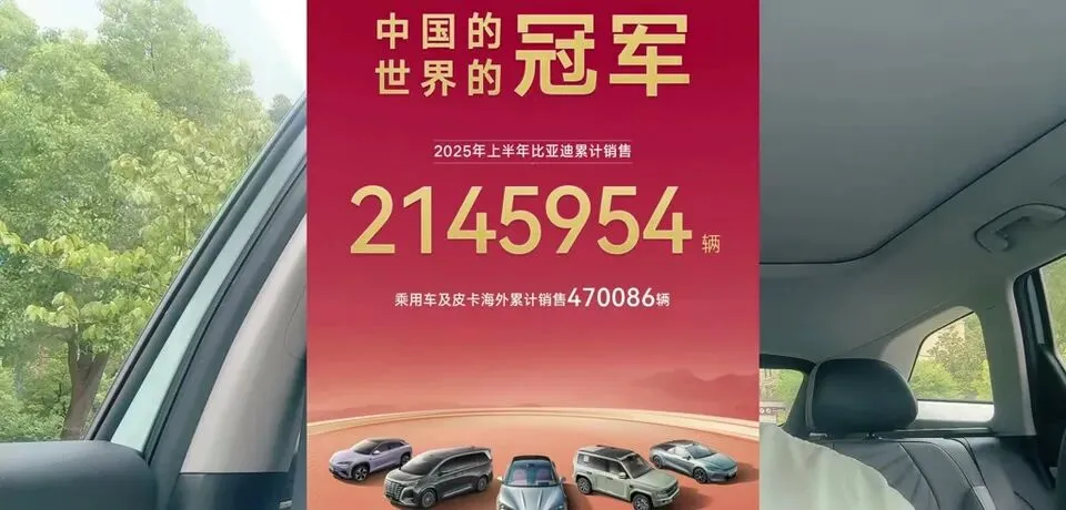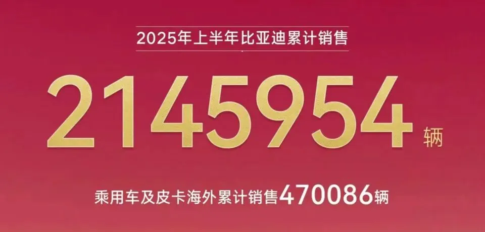 “比亚迪2025年上半年比亚迪累计销售2145954辆,乘用车及皮卡海外累计销售470086辆。”
