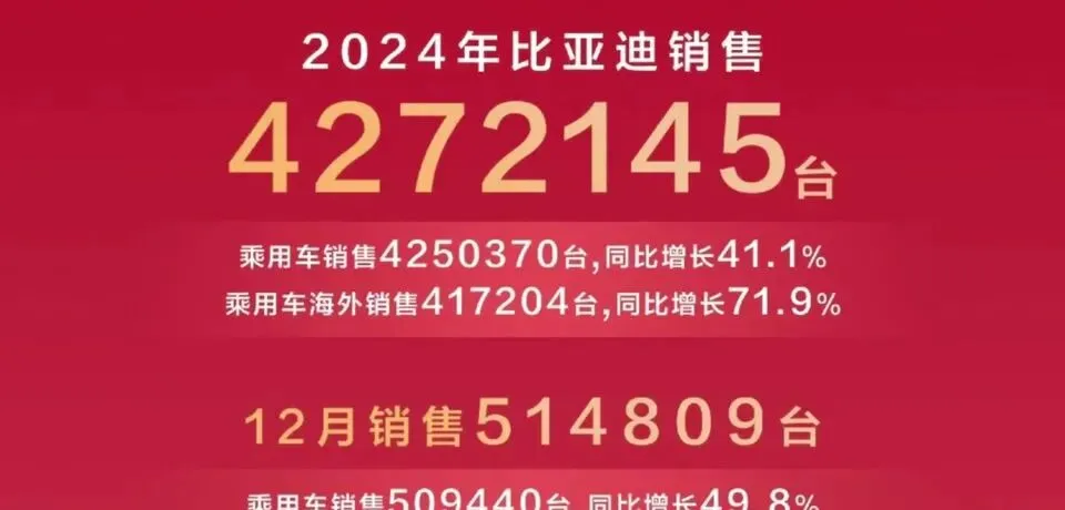 “比亚迪2024年销售4272145台,乘用车销售4250370台,同比增长41.1%,乘用车海外销售417204台,同比增长71.9%。”