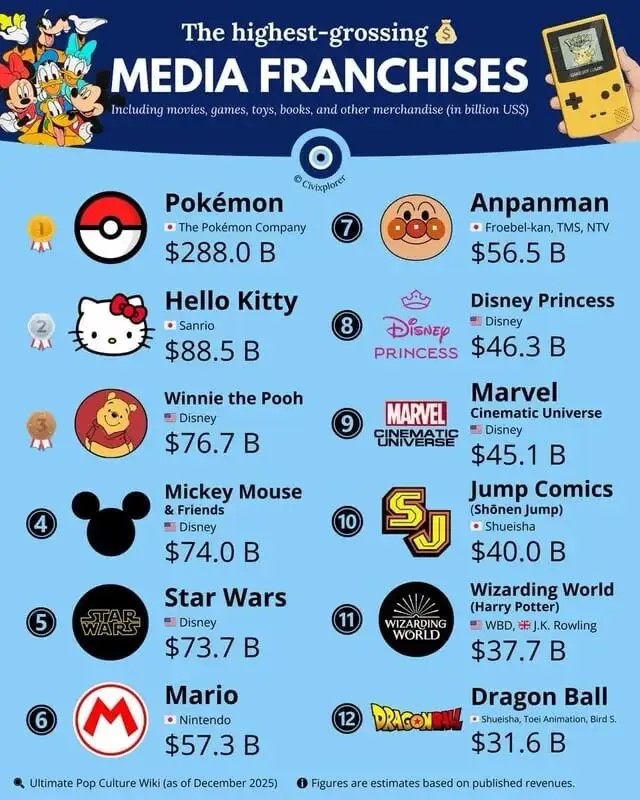 最近看到一份截至二零二五年底的全球最具商业价值媒体IP榜单。这张图表就像是一面照妖镜,把全球流行文化背后的吸金逻辑扒得一干二净。