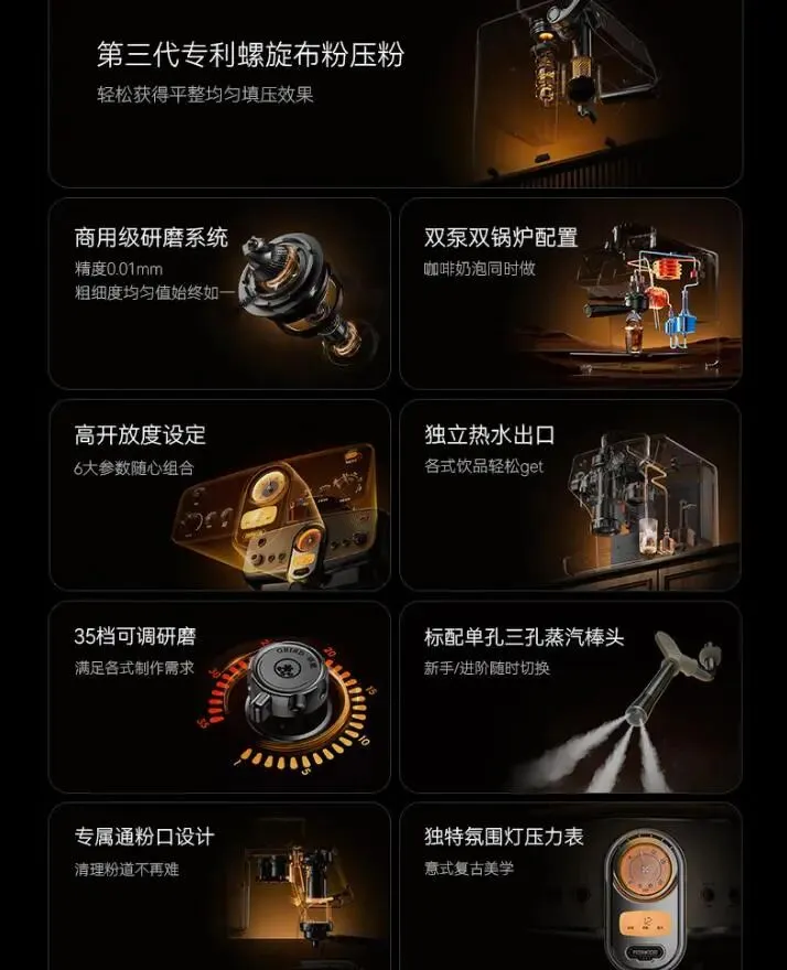 有国家补贴加持,入手能省不少钱,性价比直接拉满,米兰白复古机身颜值绝了,复古格调拉满,不管是复古风咖啡店、民宿,还是高端办公接待,都特别适配。冷热双萃设计是亮点,既能做热咖啡,也能做冷萃,夏天卖冷萃、冬天卖热饮,一年四季都能打,研磨、萃取、打奶泡一体机,不用额外搭配设备,省心又省力。