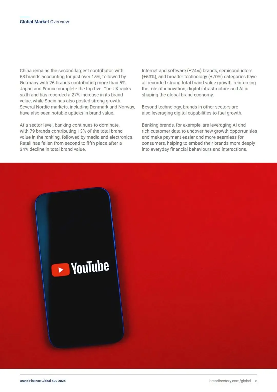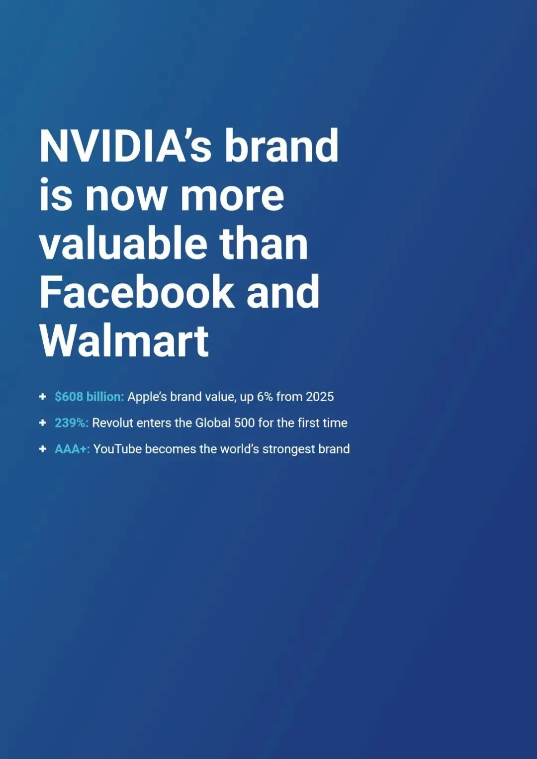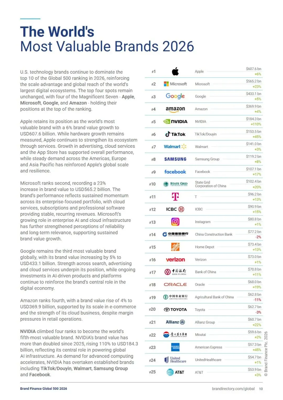 2026年度全球500强品牌总价值达10.4万亿美元,同比增长11%,全球经济温和复苏背景下,品牌价值创造逻辑向规模效应、创新投入与高增长市场拓展转变。美国仍为核心贡献国,192个品牌贡献超五成总价值,中国以68个品牌位居第二,德国、日本、法国紧随其后。行业格局呈现显著分化,银行业依旧领跑,互联网软件、半导体与科技板块涨幅突出,零售板块总价值大幅下滑。 榜单头部格局稳定,苹果、微软、谷歌、亚马逊稳居前四,苹果以6076.42亿美元品牌价值蝉联榜首;英伟达凭借AI基础设施核心地位,品牌价值暴涨110%,升至第五位。品牌强度方面,YouTube以95.3分的BSI评分成为全球最强品牌,微信、微软、谷歌、乐高位列前五。同时,Revolut以239%的增速成为榜单增长最快品牌,特斯拉品牌价值大跌35.8%,为前500品牌中降幅最大。 报告全面呈现全球品牌价值分布、行业变迁与强度差异,揭示AI技术、数字化转型与区域经济对品牌价值的核心影响,为全球品牌发展与价值评估提供权威参考。