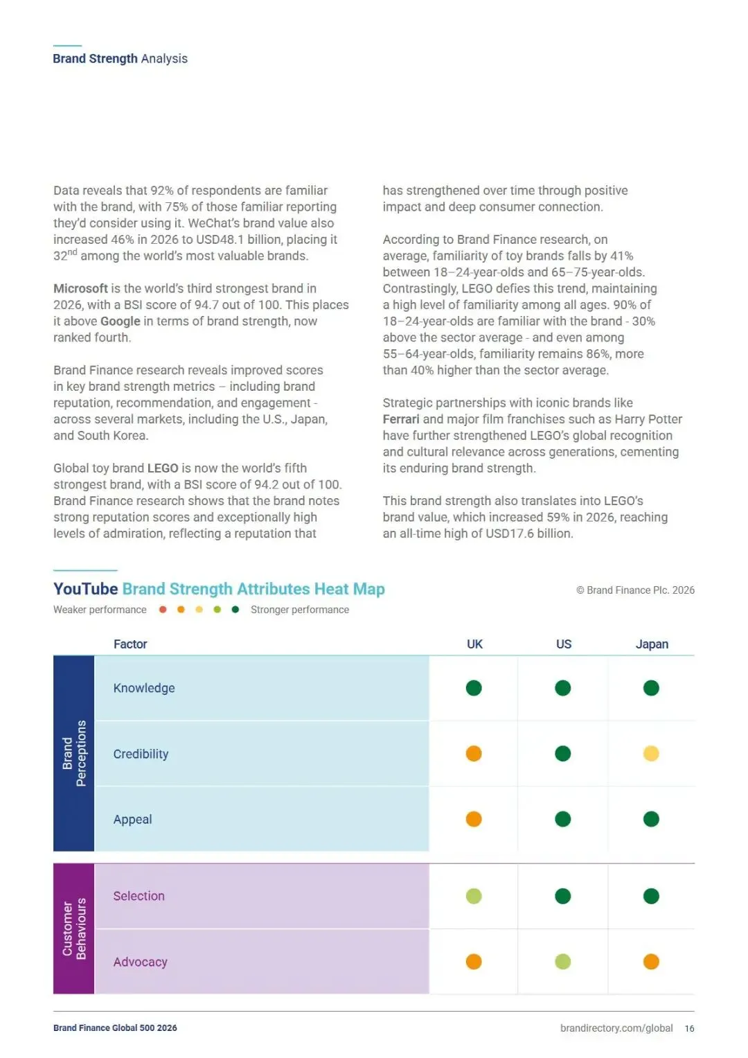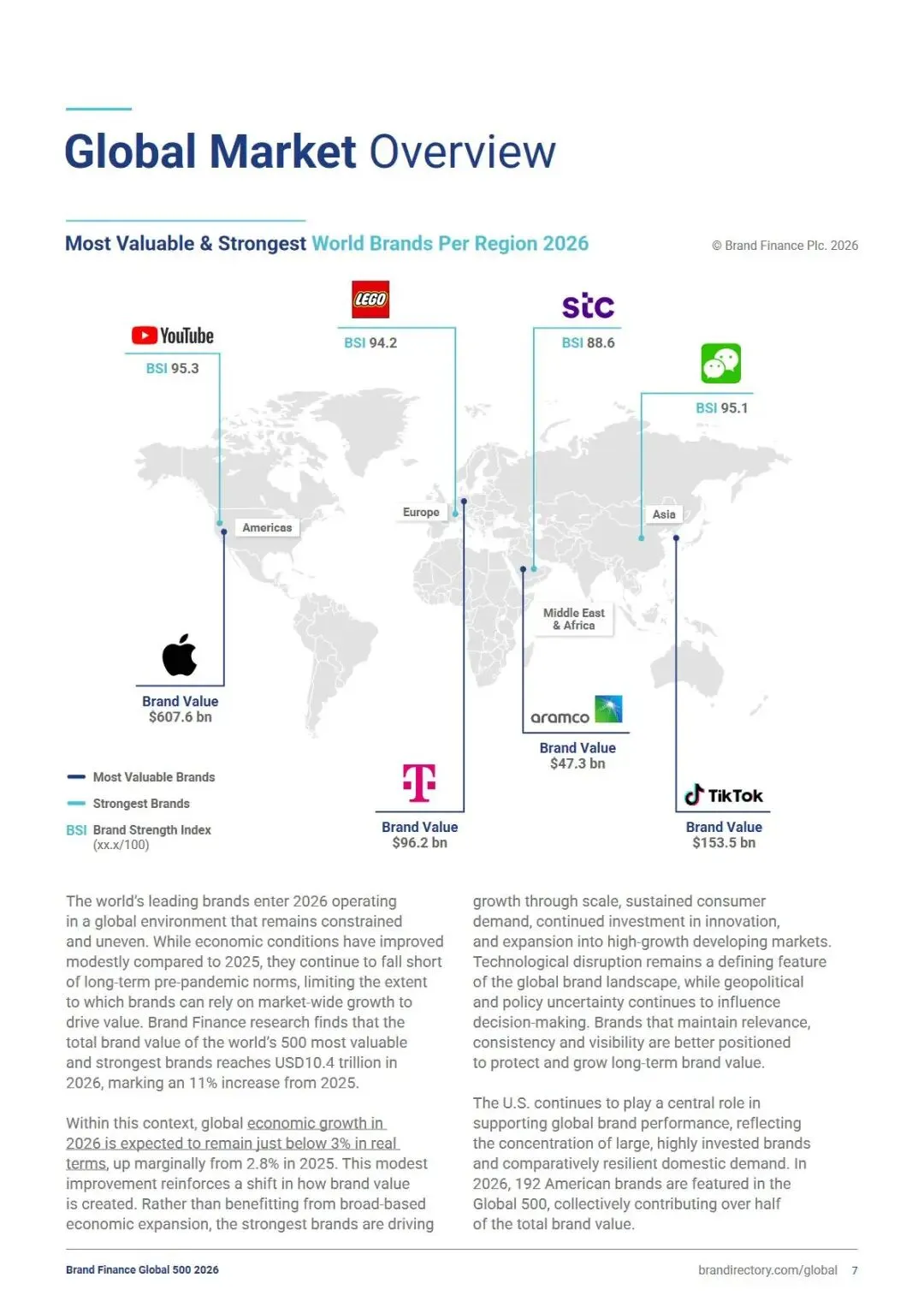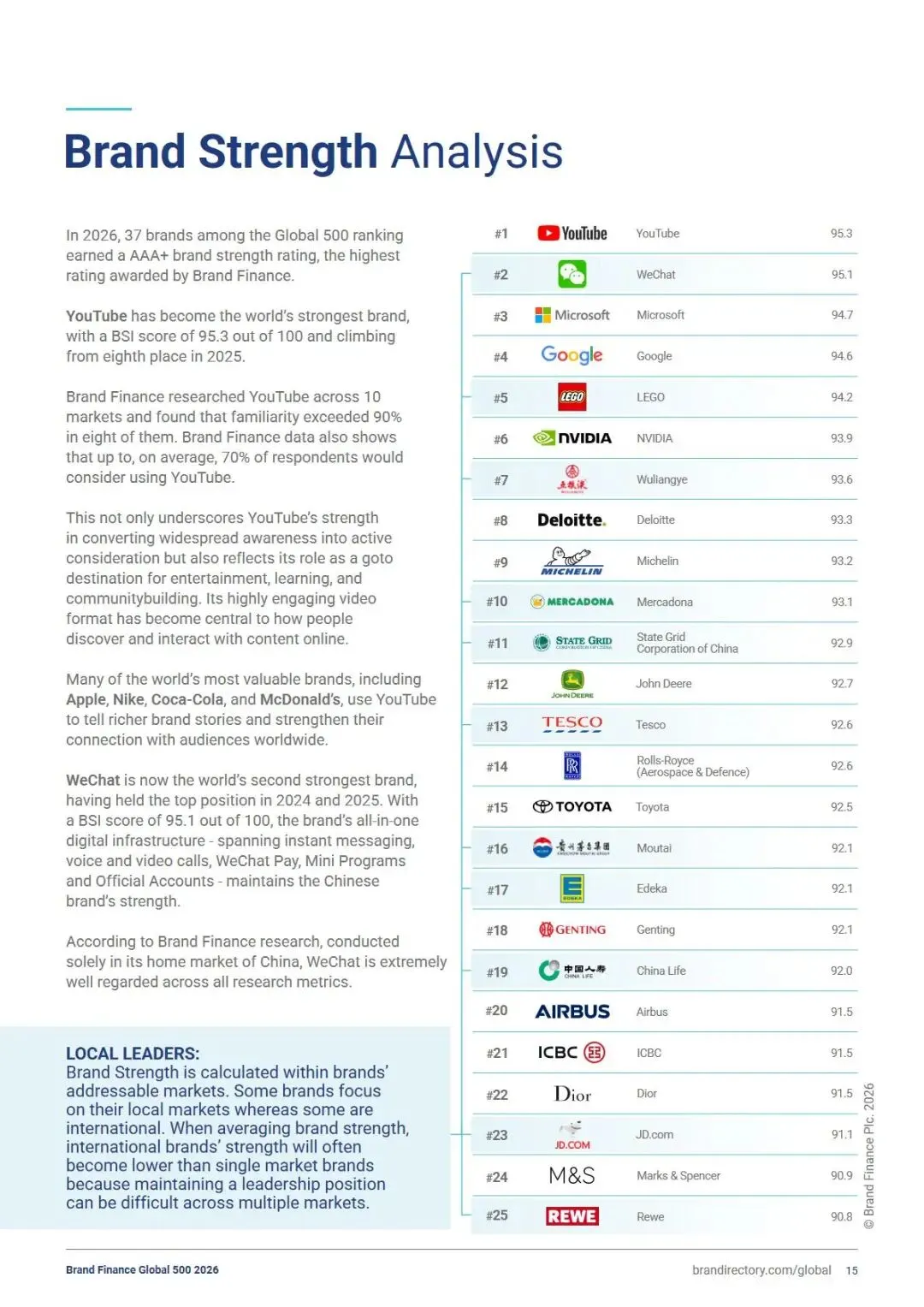 2026年度全球500强品牌总价值达10.4万亿美元,同比增长11%,全球经济温和复苏背景下,品牌价值创造逻辑向规模效应、创新投入与高增长市场拓展转变。美国仍为核心贡献国,192个品牌贡献超五成总价值,中国以68个品牌位居第二,德国、日本、法国紧随其后。行业格局呈现显著分化,银行业依旧领跑,互联网软件、半导体与科技板块涨幅突出,零售板块总价值大幅下滑。 榜单头部格局稳定,苹果、微软、谷歌、亚马逊稳居前四,苹果以6076.42亿美元品牌价值蝉联榜首;英伟达凭借AI基础设施核心地位,品牌价值暴涨110%,升至第五位。品牌强度方面,YouTube以95.3分的BSI评分成为全球最强品牌,微信、微软、谷歌、乐高位列前五。同时,Revolut以239%的增速成为榜单增长最快品牌,特斯拉品牌价值大跌35.8%,为前500品牌中降幅最大。 报告全面呈现全球品牌价值分布、行业变迁与强度差异,揭示AI技术、数字化转型与区域经济对品牌价值的核心影响,为全球品牌发展与价值评估提供权威参考。