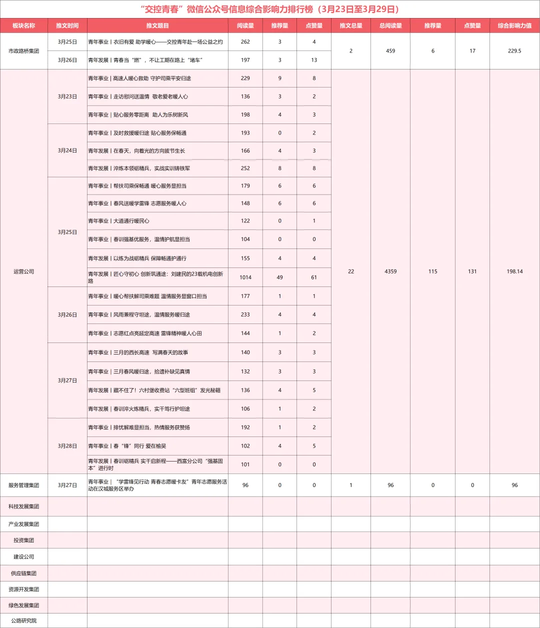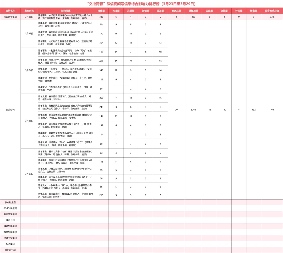综合影响力值=信息推文量+平均阅读量+在看量+点赞量,上周统计数据值得注意的问题:除市政路桥集团、运营公司、服务管理集团外,集团公司所属科技发展集团、产业发展集团、供应链集团、建设公司、投资集团、公路研究院,绿色发展集团、资源开发集团8个板块信息推送量均为零。综合影响力值=视频推送量+平均播放量+关注量+评论量+转发量+点赞量,上周统计数据值得注意的问题:除市政路桥集团、运营公司外,集团公司所属供应链集团、科技发展集团、产业发展集团、服务管理集团、投资集团、建设公司、绿色发展集团、资源开发集团以及公路研究院9个板块信息推送量均为零。榜单说明: