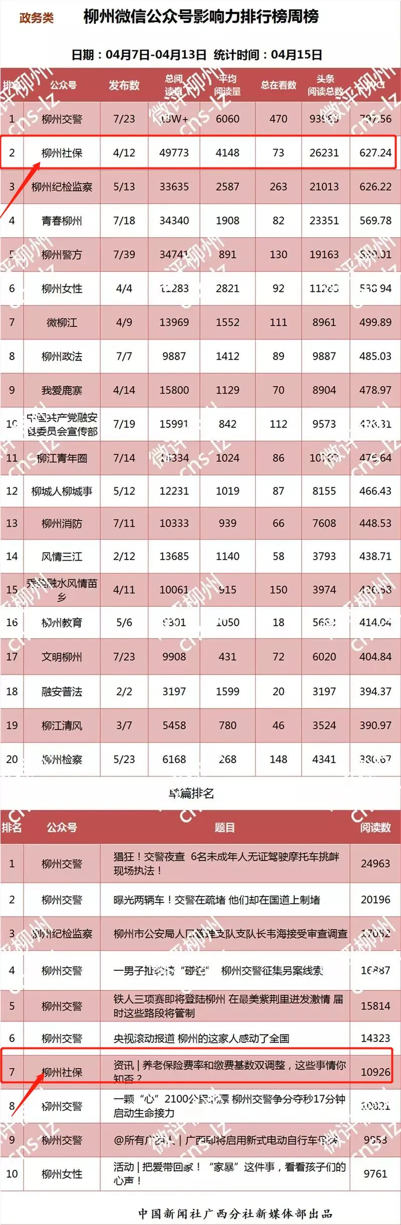 上周,“柳州交警”稳坐排行榜第一,“柳州社保”紧随其后。“柳州纪检监察”“青春柳州”“柳州警方”“柳州女性”等微信公众号均排名上升较大,进入榜单前十。