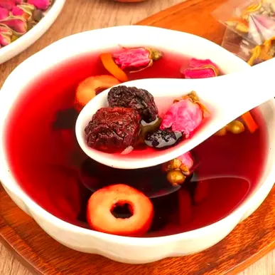 准备:山楂15g去核,红枣3~4颗,清水500毫升,少许冰糖,玫瑰花视情况添加。