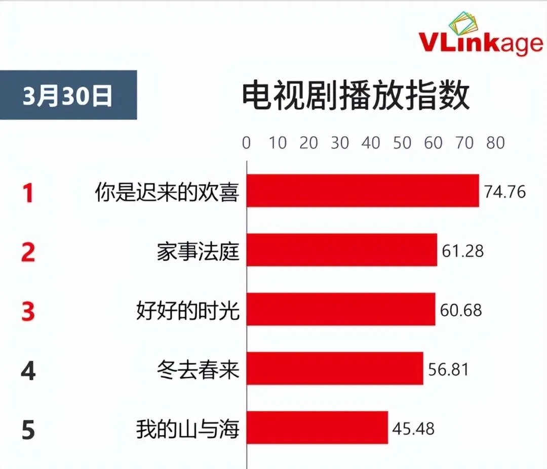 截止发文时间,从“Vlinkage”数据显示可知,当前热播电视剧中,播放指数最高的五部剧分别如下: