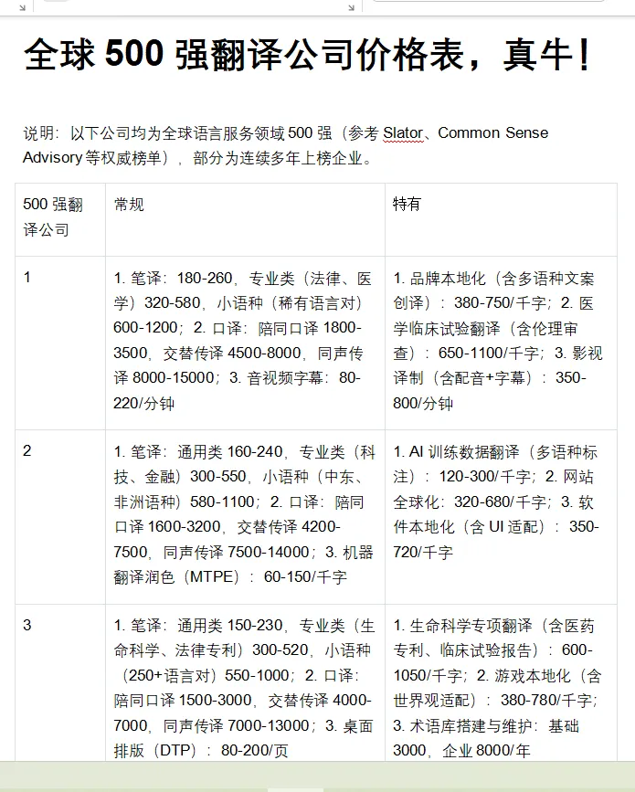 3 | 1. 笔译:通用类150-230,专业类(生命科学、法律专利)300-520,小语种(250+语言对)550-1000;2. 口译:陪同口译1500-3000,交替传译4000-7000,同声传译7000-13000;3. 桌面排版(DTP):80-200/页 | 1. 生命科学专项翻译(含医药专利、临床试验报告):600-1050/千字;2. 游戏本地化(含世界观适配):380-780/千字;3. 术语库搭建与维护:基础3000,企业8000/年 |