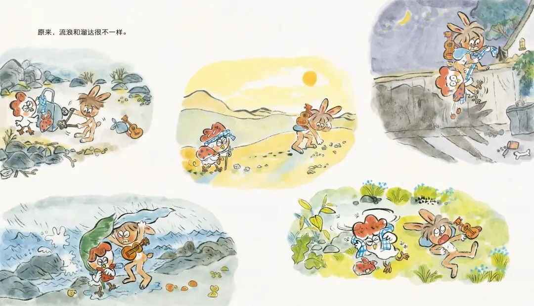 农场里悠闲自在的溜达鸡,遇见了风雨中一路冒险的流浪兔。“流浪”这个充满诱惑的词,为溜达鸡打开了幻想的大门:那条未走过的路上,是否充满自由与诗意?