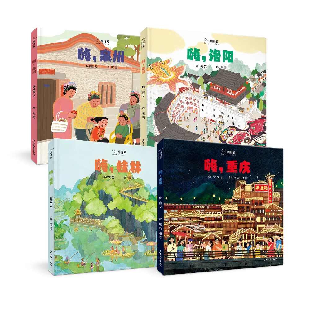 “小小旅行家”人文地理绘本第四辑(《嗨,重庆》《嗨,桂林》《嗨,洛阳》《嗨,泉州》),以童趣视角展开祖国山河画卷与人文肌理。乘索道穿行山城,撑竹筏漫游水墨桂林,在洛阳触摸石刻千年余温,于泉州聆听海风诉说丝路往事。