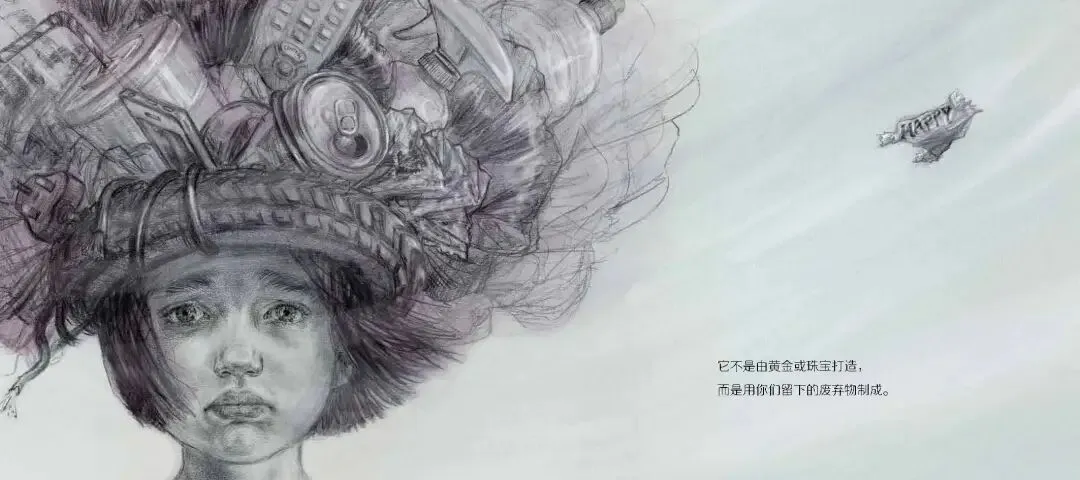 一本动人心魄的环保主题绘本。一位来自未来的女孩,戴着一顶从前人这里继承的王冠,一顶由废弃的易拉罐、塑料瓶、破手机等垃圾堆成的王冠。
