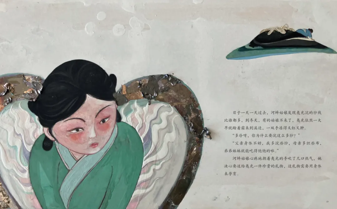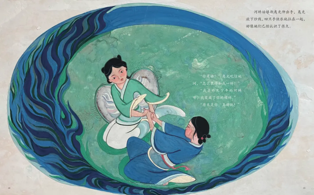 作家汤汤用珍珠串联起西施与河蚌姑娘的相遇、报恩、别离和等待。读者不仅可以通过文字感受到如珍珠般坚固璀璨的友情,更能读到勇敢、善良的珍贵。而画家阿涩以珍贵矿物颜料为媒介,用岩彩画手法为故事赋予了厚重又灵动的视觉质感。翻开绘本,就像走进一座小型艺术展,孩子在感受故事魅力的同时,潜移默化提升审美眼光与艺术敏感度。