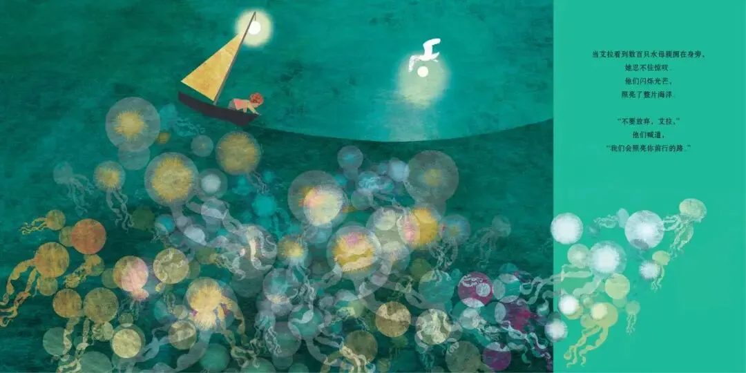 这是一本充满诗意与哲理的儿童图画书,讲述了小女孩艾拉在浩渺大海中独自航行的冒险故事。在黑暗、未知的大海中,艾拉面对着狂风巨浪的挑战和深海中神秘的声音,她感到孤单与恐惧。然而,艾拉遇到了引导她的白鸟、陪伴她的海豚,以及带领她走向内心觉醒的鲸鱼。这些生物给了她希望、力量与指引,帮助她战胜了巨大的恐惧与不安。