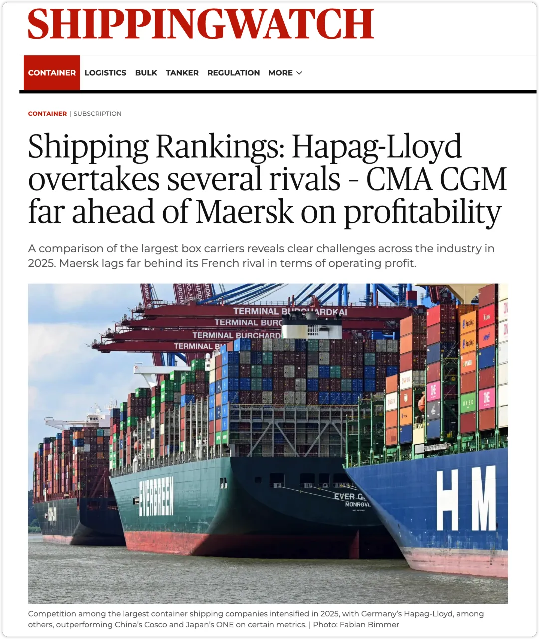 德国的赫伯罗特正在穿越类似的隘口。利润率滑落至16.7%看似刺眼,但在收入与EBITDA名次上超越竞争对手,说明其在价格纪律与客户结构上做了艰难而必要的取舍。过去几年,这家公司在IT系统、数字化订舱、以及少量但精确的码头投资上持续加码,其打法更像一名“纪律型射手”:不争全场出手数,但在关键点位维持命中率。红海绕航与欧洲港口的局部拥堵,提高了网络的复杂度,也压低了短期边际利润。下一阶段,随着Gemini合作的深入与网络磨合,赫伯罗特的单位成本与服务稳定性存在改善弹性。