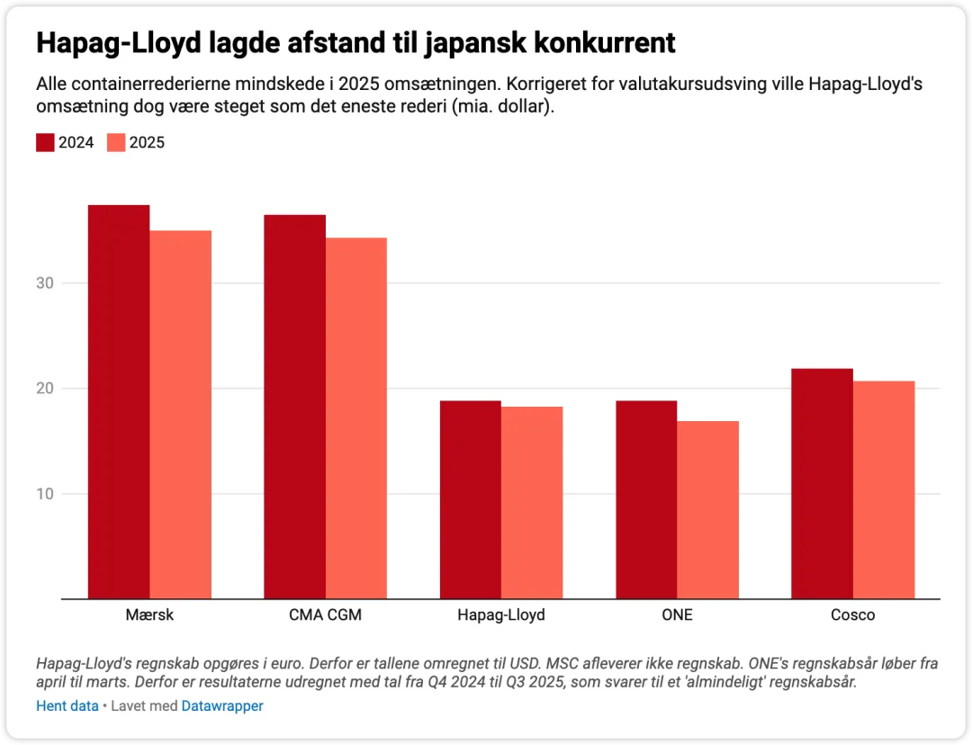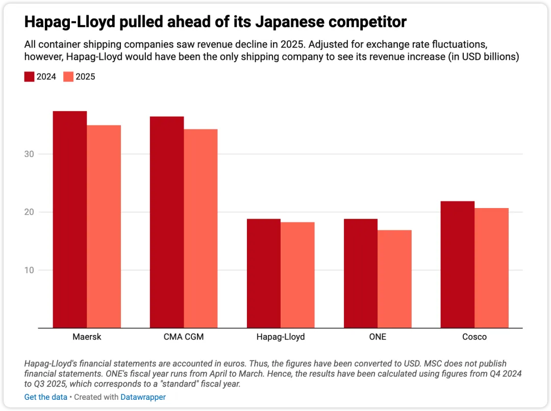 在全球集装箱航运业普遍放缓的2025年,行业龙头的座次在多项核心指标上出现微妙变化。根据ShippingWatch对全球五大集装箱航运公司(马士基、法国达飞集团CMA CGM、赫伯罗特、中远海运以及海洋网联ONE)2025年财务报表的对比,法国达飞在盈利能力上继续领跑,而马士基明显落后;赫伯罗特则在营收和经营利润上双双超越部分竞争对手。
