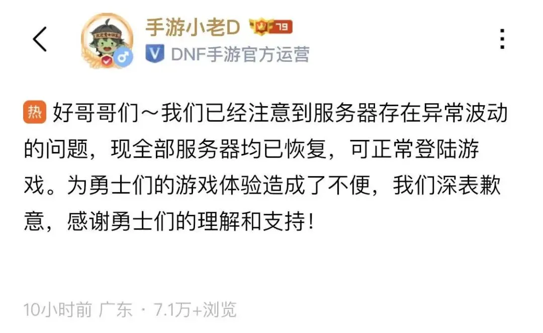 兄弟们,昨晚DNF手游宣布1号凌晨更新后,在10点45分左右出现了网络波动和异常状况,小老D连续发文致歉,多位水友晒出了游戏画面,就连手游主播都受到了波及,还好问题很快解决了,就等着策划补偿了。