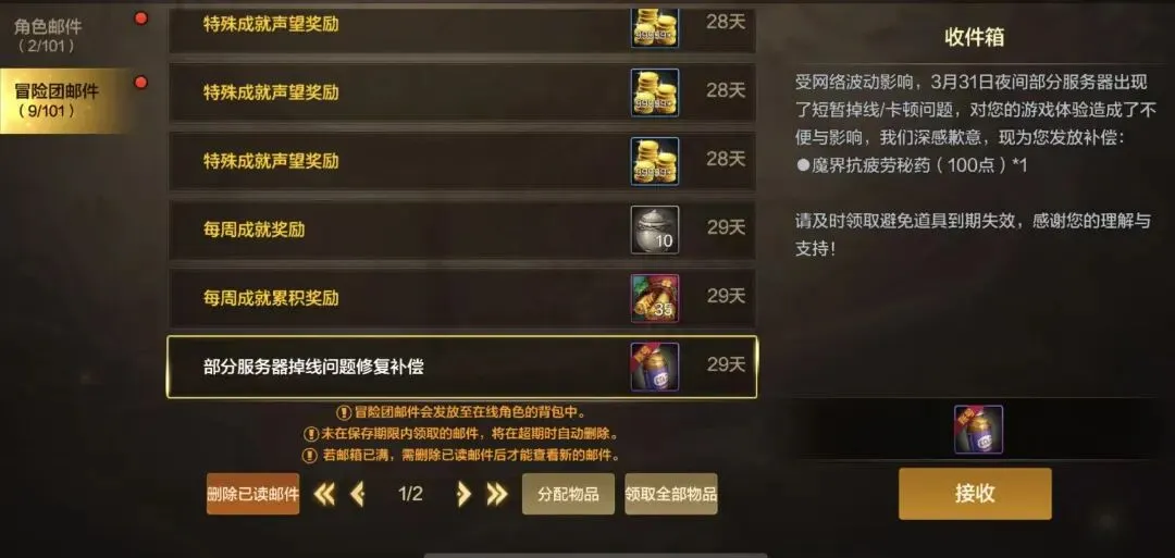 就在小老D发文道歉后,就已经有水友留言,要求策划继续补偿疲劳药水,结果策划真的就是补偿了100点药水,大家上号后就能在游戏邮箱中领取。